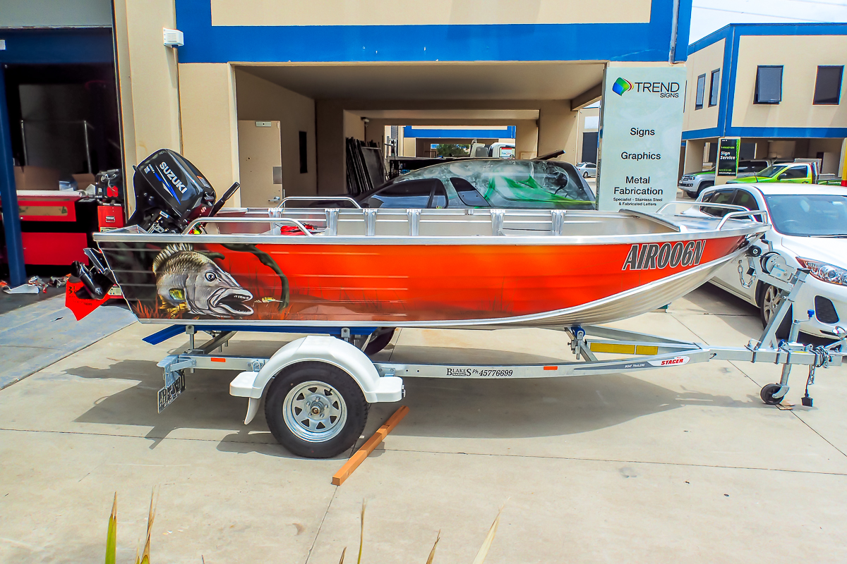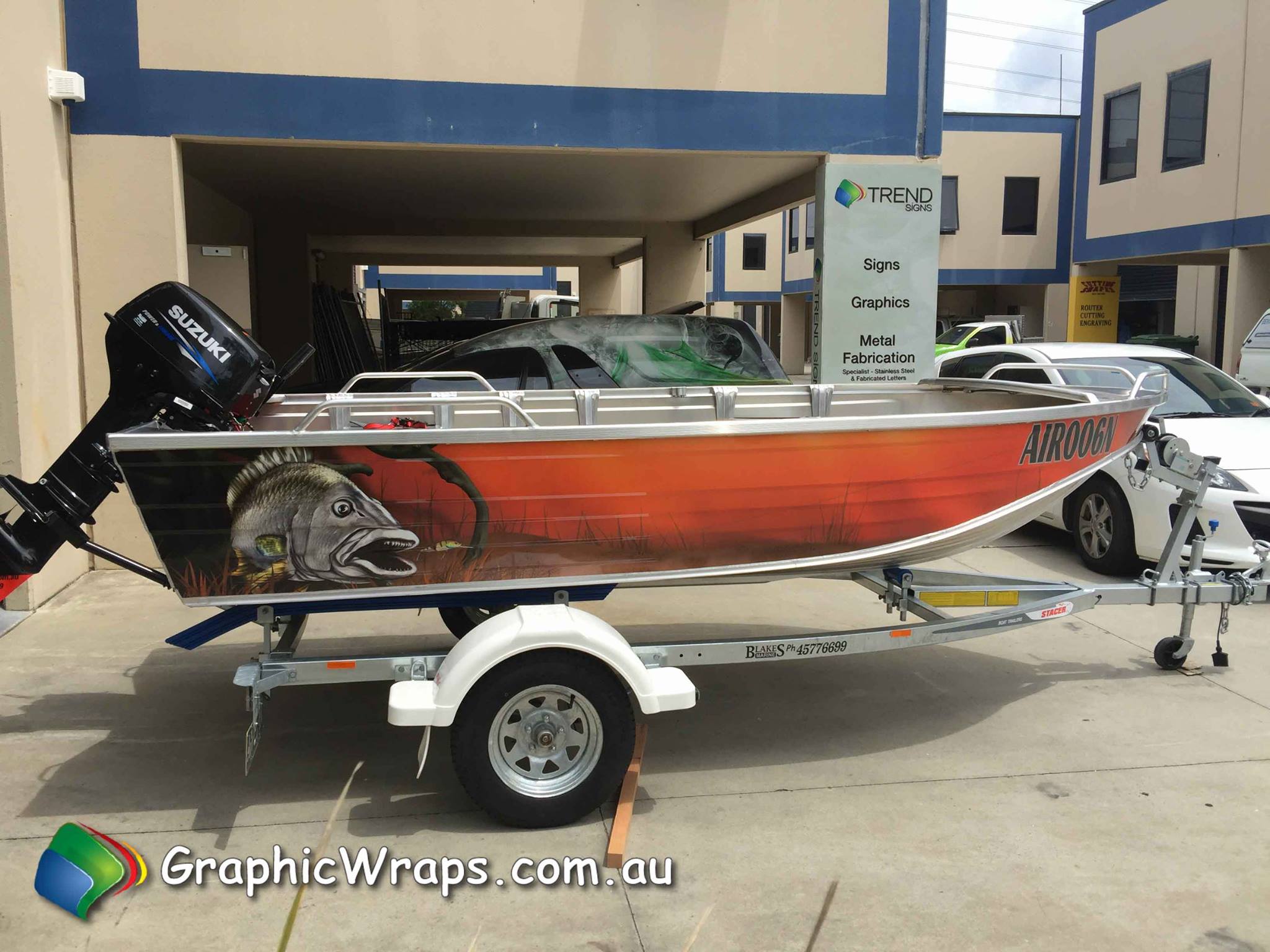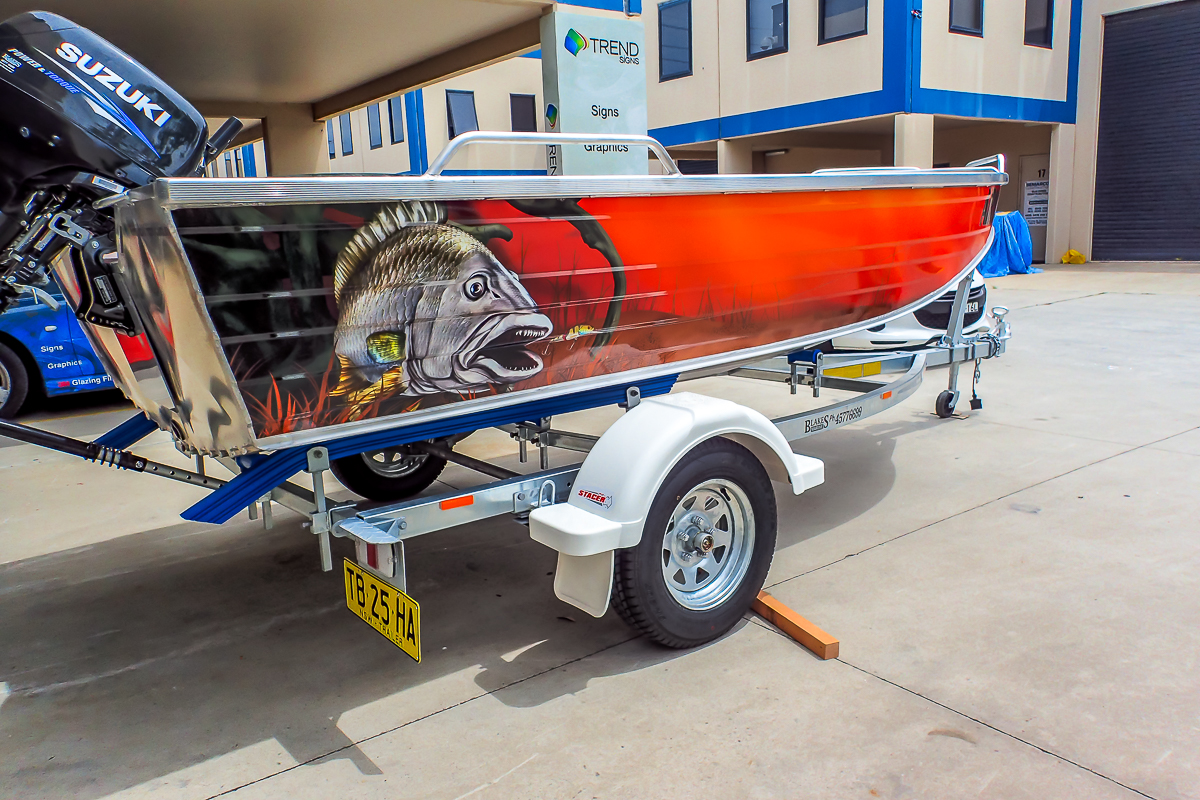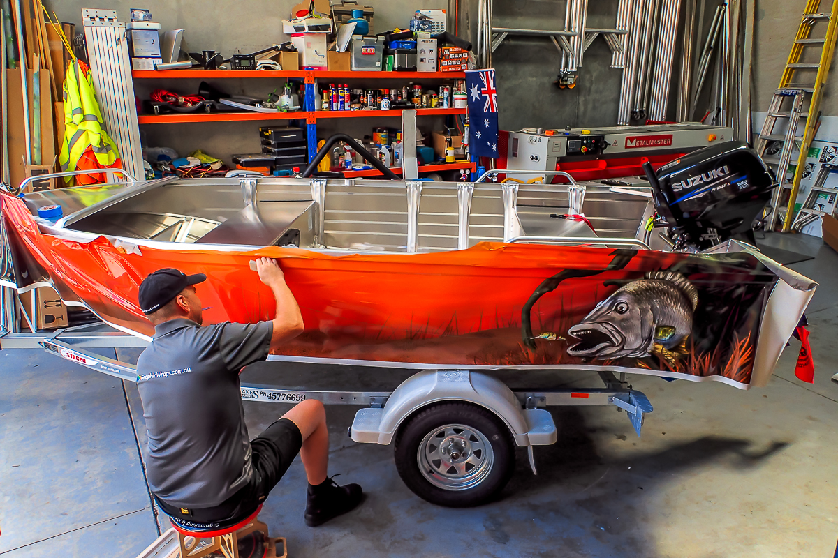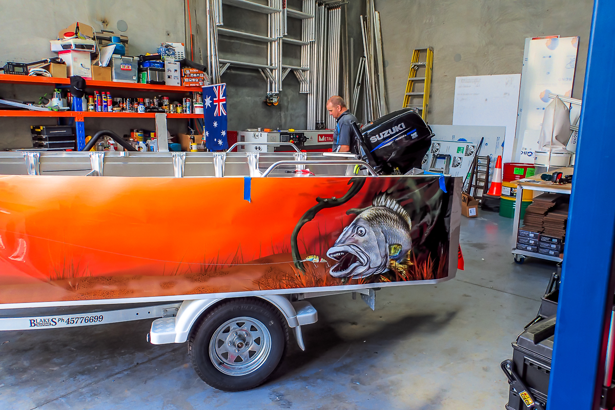 The day started with a 4:30am alarm (aagghhh) and I was soon headed down to Taren Point to see Craig at Graphic Wraps. Craig met me outside the factory at 7am and went straight to work designing my wrap. I had this image of a burnt orange boat with a killer Bream about to smash a lure. Craig was all over it and after a couple of hours on Photoshop I felt like Craig had reached inside my brain and pulled the image straight out.