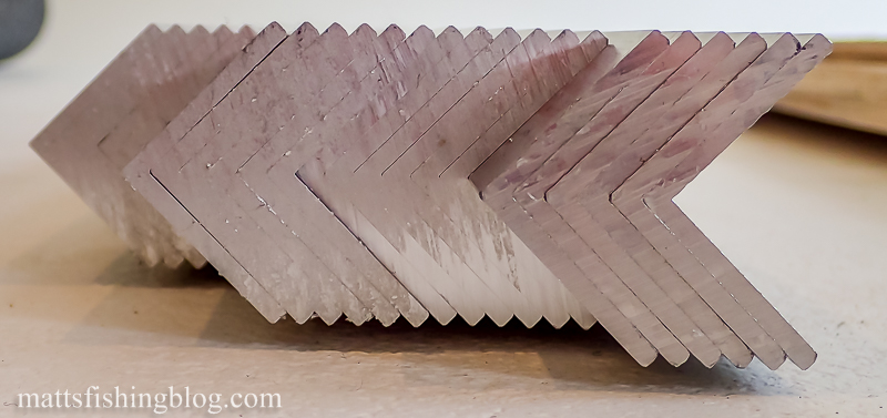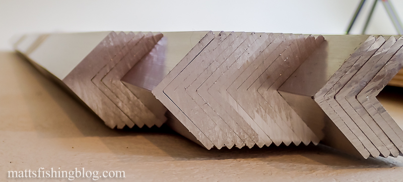 After inspecting the aluminium and considering the balance between weight and strength, I decided to go for 32mmx32mmx3mm 6060 T5 angle for my floor supports. This came in at 0.49kg per meter and is supplied in 3.25 or 6.5 meter lengths. In the end I bought 6 x 6.5 lengths (39 meters) for a total weight of 19kg. After off cuts I’m expecting the weight to drop by probably 20% which will make it around 15Kg of frame weight added to the boat for the middle, casting platform and rear frames.